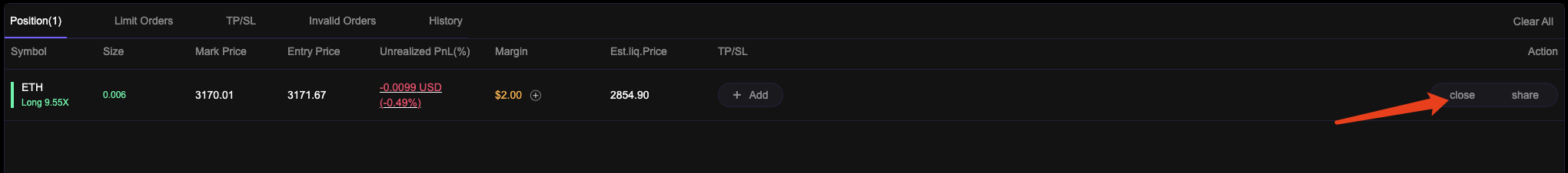 You can also close your position on the "CLOSE" page.
