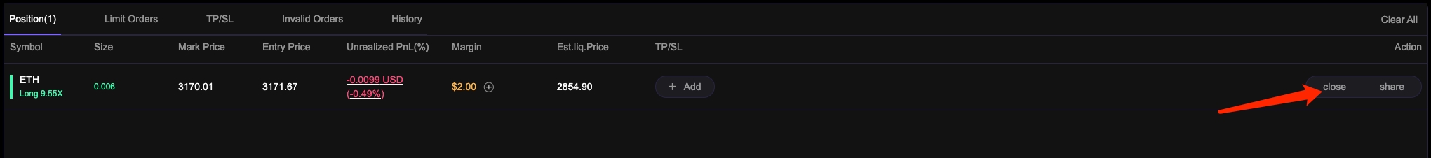 View your unclosed contract orders in "Current Positions", click "Close" button. Click "Confirm" in the pop-up modal, then confirm the transaction in your wallet to close the current order. Close All" means to close all unclosed orders.